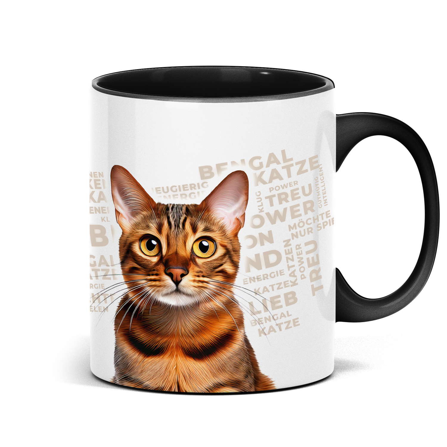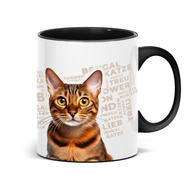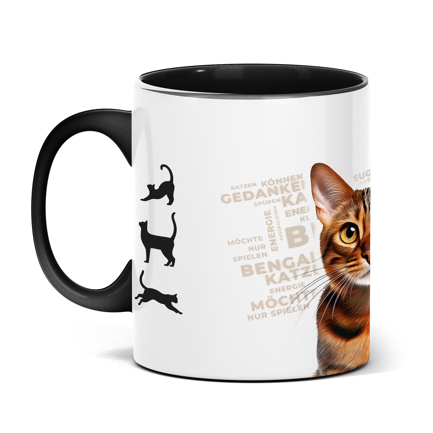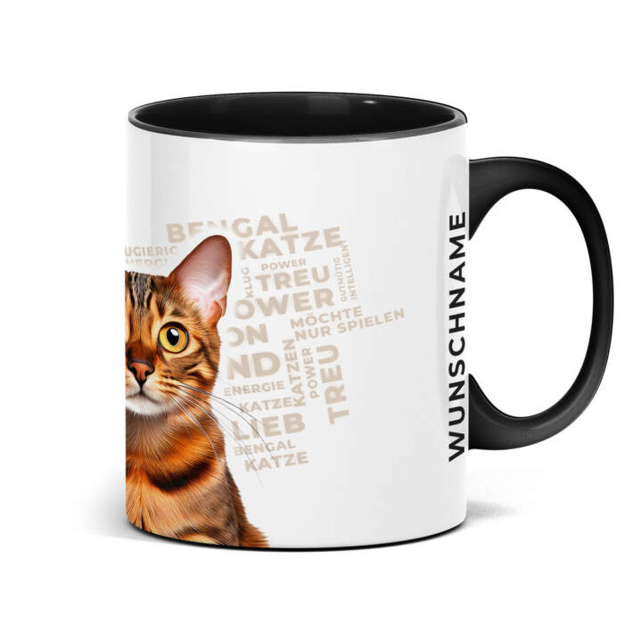Hochwertige Keramiktasse mit farbigem Henkel und Innenseite, liebevollem Bengalkatzen-Design und optionaler Personalisierung. Spülmaschinen- und mikrowellengeeignet, langlebiger Druck. Made in Germany – ideal als individuelles Geschenk für jeden Katzenfan!