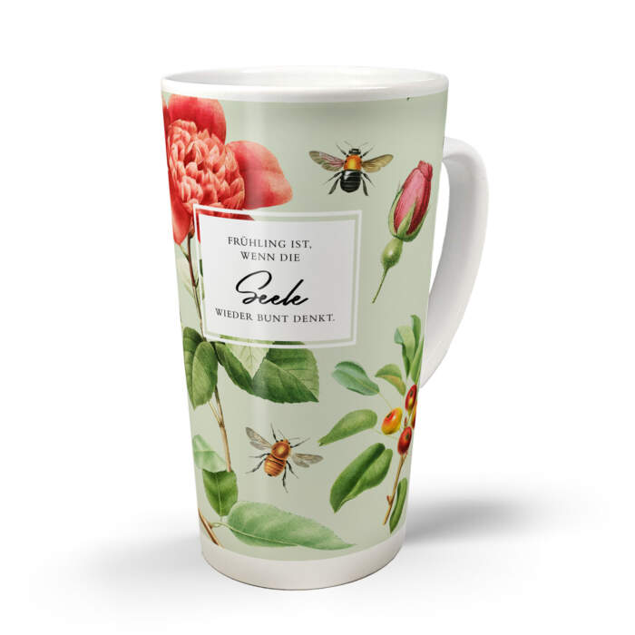 Schöne XXL Blumentasse mit Spruch: „Frühling ist, wenn die Seele wieder bunt denkt.“