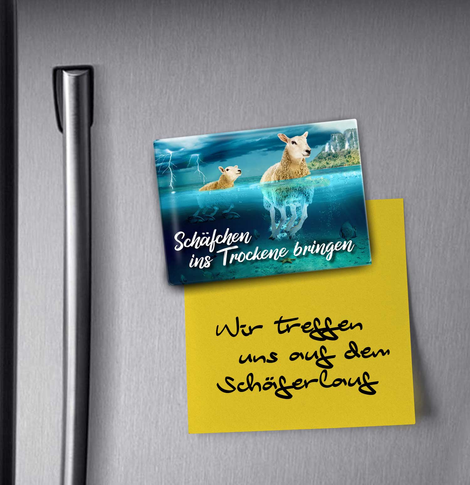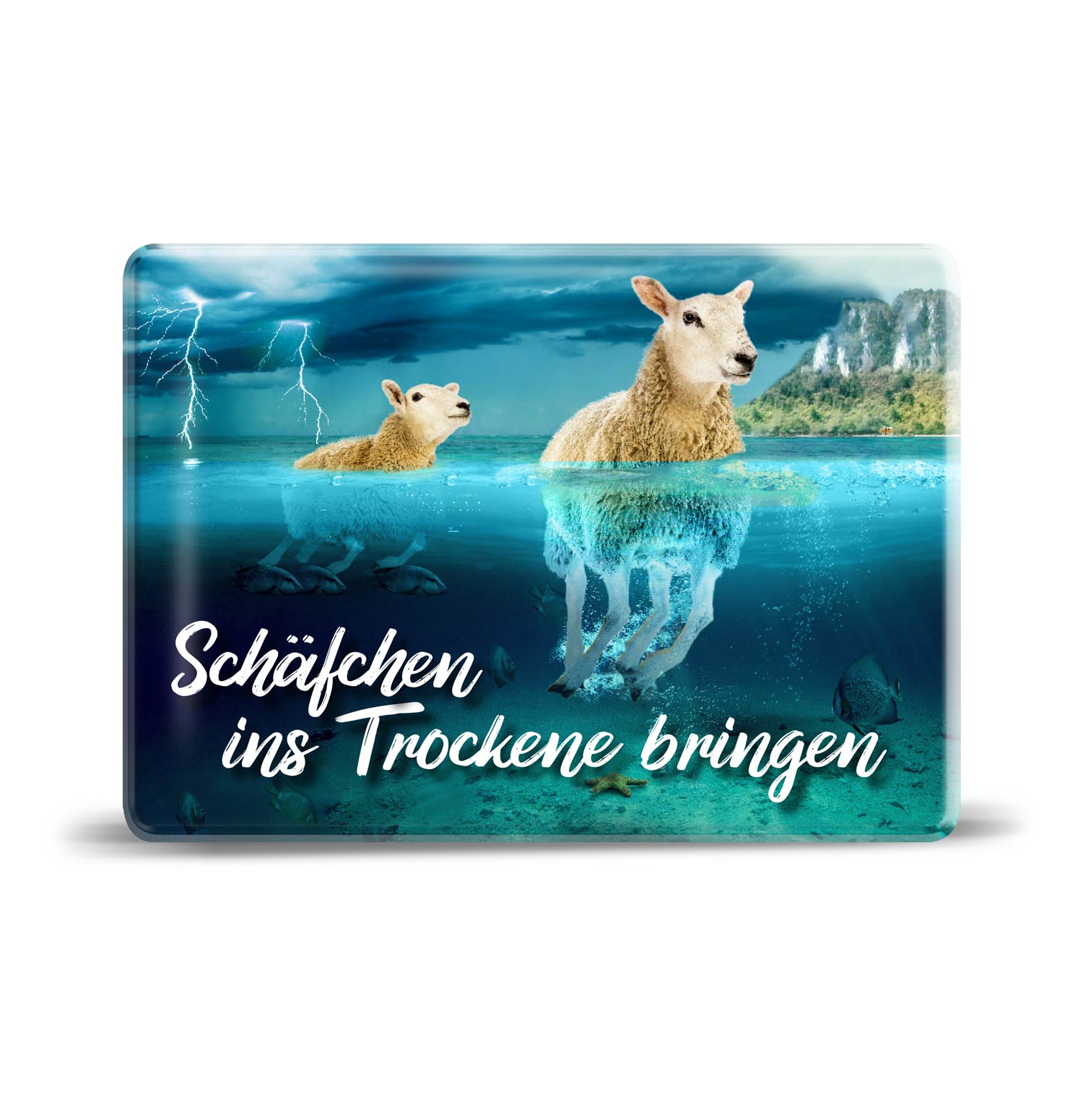Foto-Glasmagnet für alle, die ihre Schäfchen ins Trockene bringen möchten. Ideal für den Kühlschrank oder andere magnetischen Flächen.