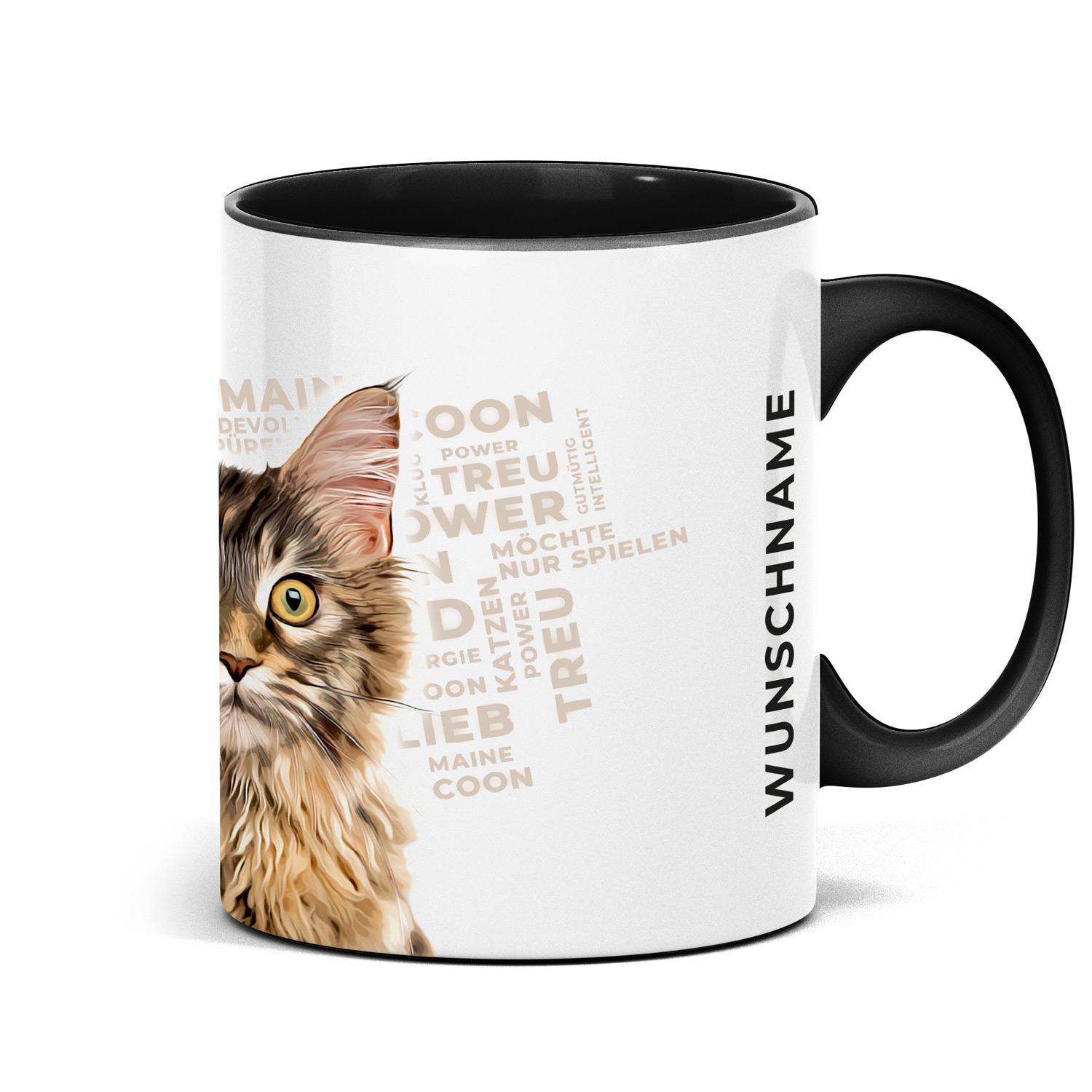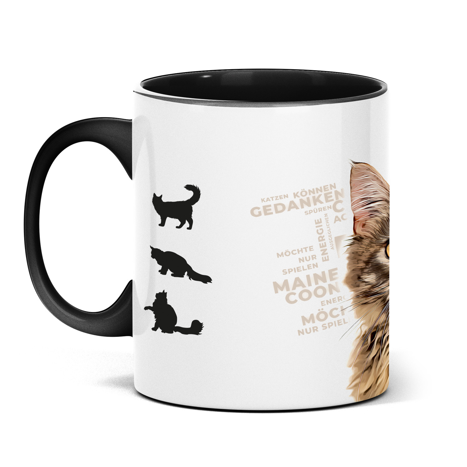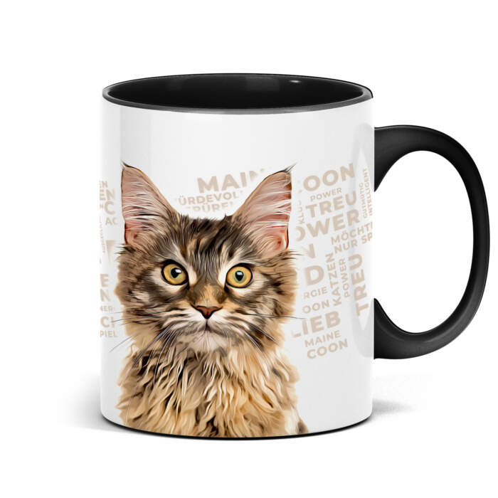 Diese hochwertige Keramiktasse mit Katzenmotiv hat eine farbige Innenseite und einen farbigen Henkel. Der rundum aufgebrachte Maine-Coon-Druck ist ein echter Hingucker – ein Must-have für Katzenliebhaber! Mit einem Volumen von ca. 330 ml, 95 mm Höhe und 80 mm Durchmesser liegt sie angenehm in der Hand. - Made in Germany – personalisiertes Katzengeschenk