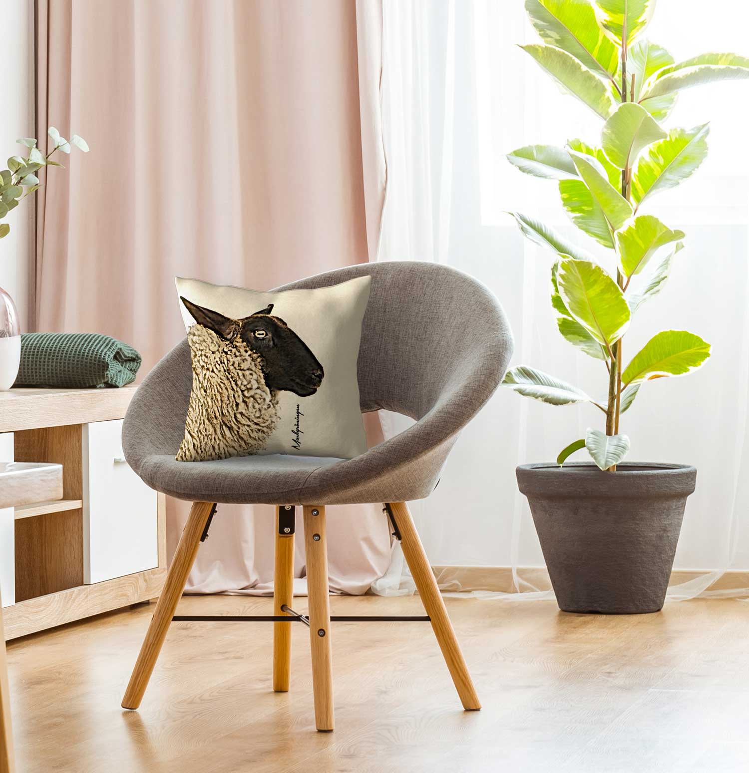 Eleganter Kissenbezug mit Schafmotiv in Natur-Leinenoptik.
