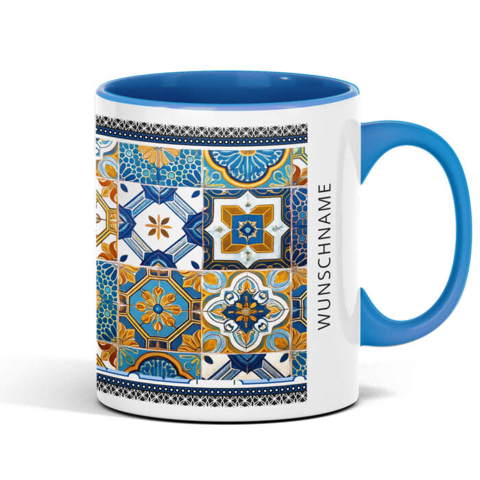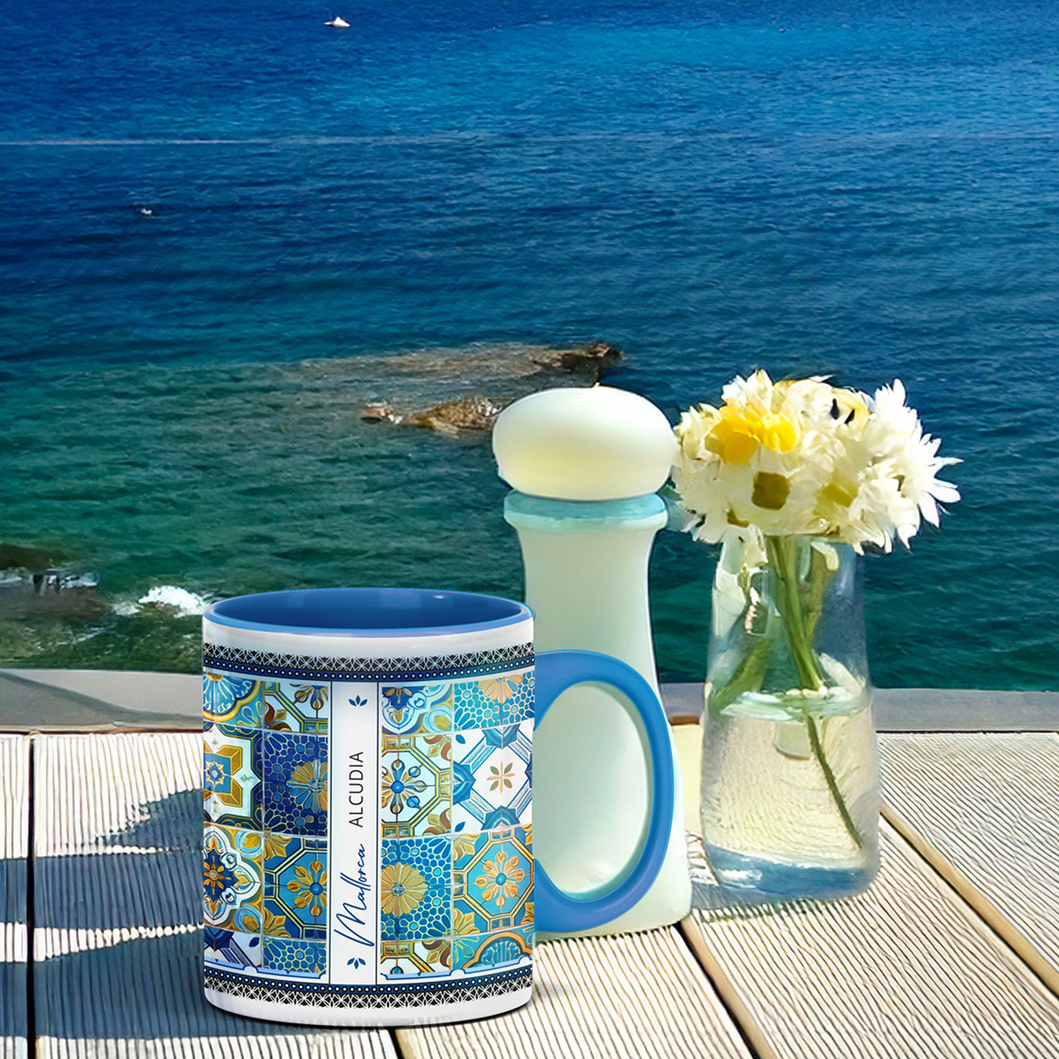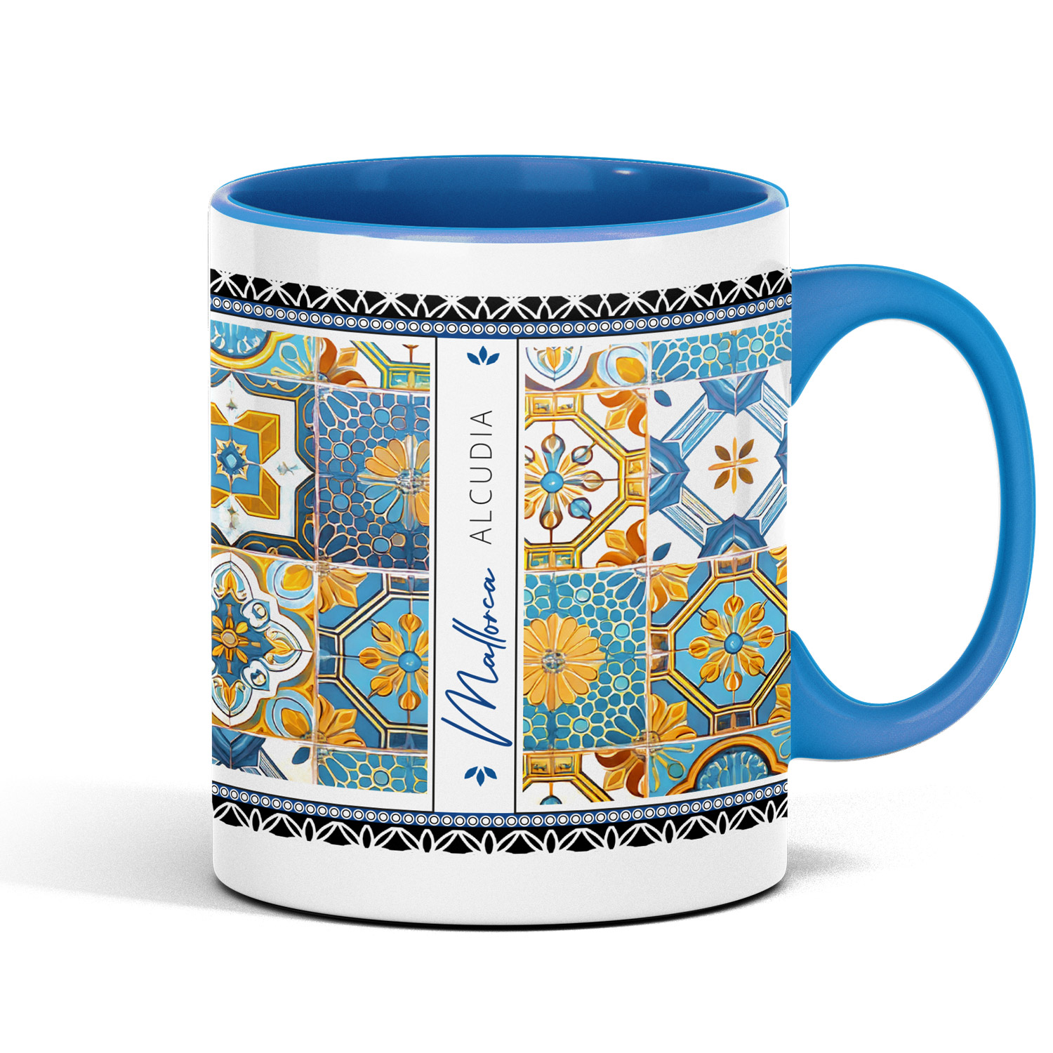 Diese liebevoll gestaltete Tasse im typisch spanischen Fliesenstil mit Alcudia lässt sich individuell mit deinem Wunschort auf Mallorca – z. B. Alcúdia, Cala Millor, Playa de Muro, Palma, Valldemossa, Cala Ratjada, Paguera, Can Picafort – und optional mit einem Wunschnamen personalisieren.