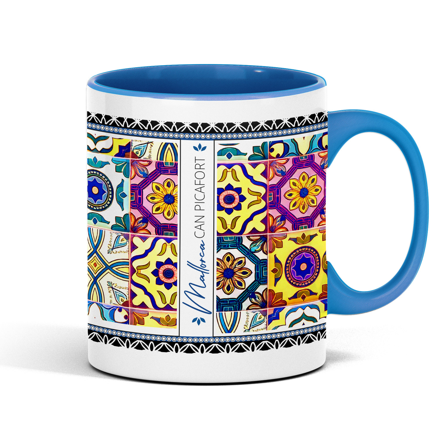 Diese liebevoll gestaltete Tasse im typisch spanischen Fliesenstil mit Can Picafort lässt sich individuell mit deinem Wunschort auf Mallorca – z. B. Alcúdia, Cala Millor, Playa de Muro, Palma, Valldemossa, Cala Ratjada, Paguera, Can Picafort – und optional mit einem Wunschnamen personalisieren.