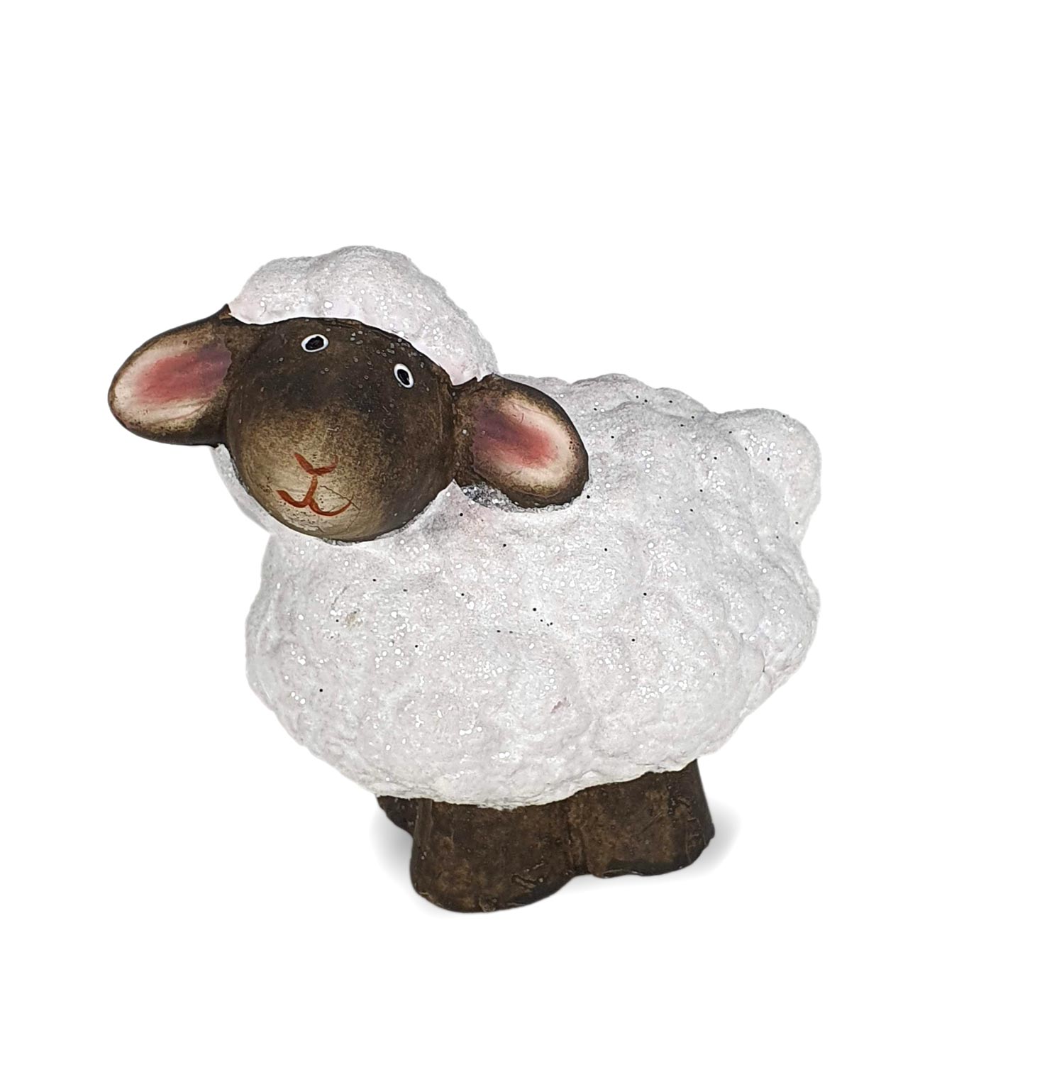 SCHÖNE DEKORATION: Das liebevoll gestaltete Schaf mit weißem Glitzer ist eine perfekte Deko für den Garten, Balkon oder die Wohnung