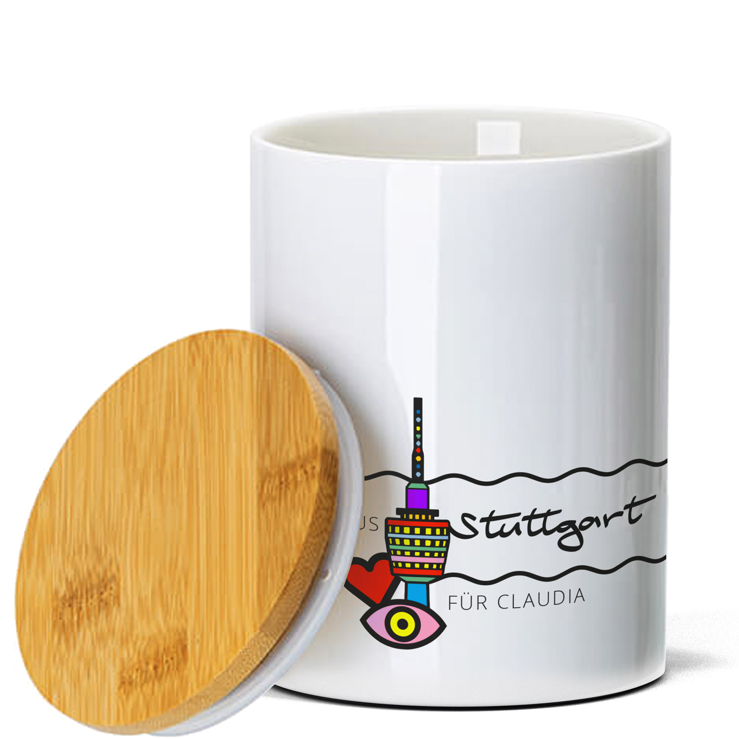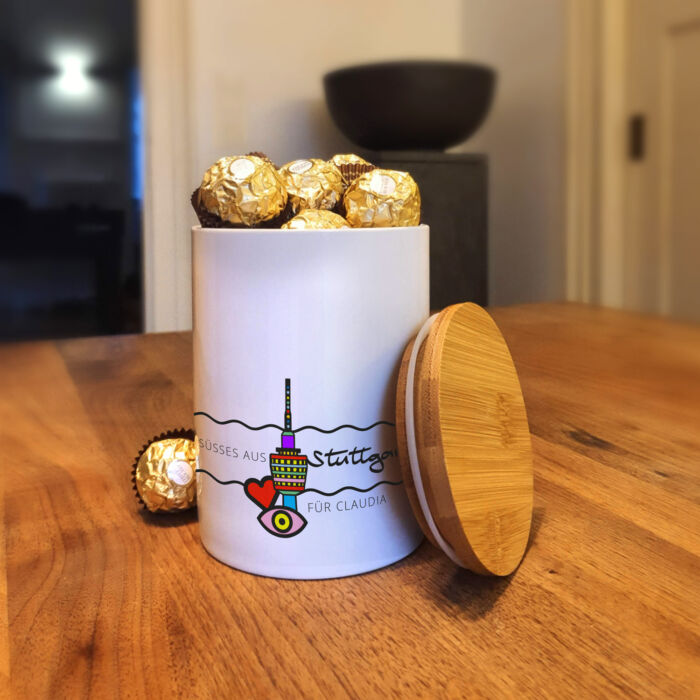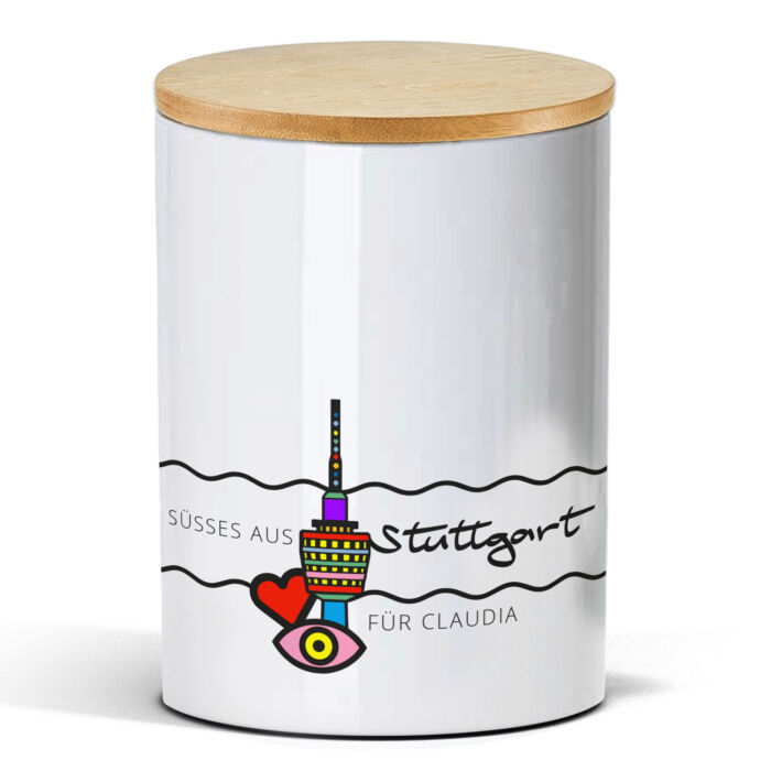• TOLLE GESCHENKIDEE: Vorratsdose aus Keramik mit Stuttgartmotiv liebevoll gestaltet und optional personalisiert mit Deinem Wunschnamen. Füllst Du die Aufbewahrungsdose mit Pralinen, Süßigkeiten, Bonbons, typisch schwäbischen Wibele oder mit Geld – ist das einfach eine tolle individuelle Geschenkidee für Kollegin oder Kollege, Mann oder Frau, Freund oder Freundin oder als Souvenir von Stuttgart.